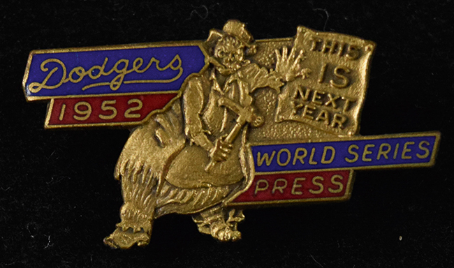 Description:1952 Brooklyn Dodgers World Series press pin (EX-EX/MT) Original pin displaying a touch of light/mild wear retains screw down closure on "Dieges & Clust" marked back: EX-EX/MT