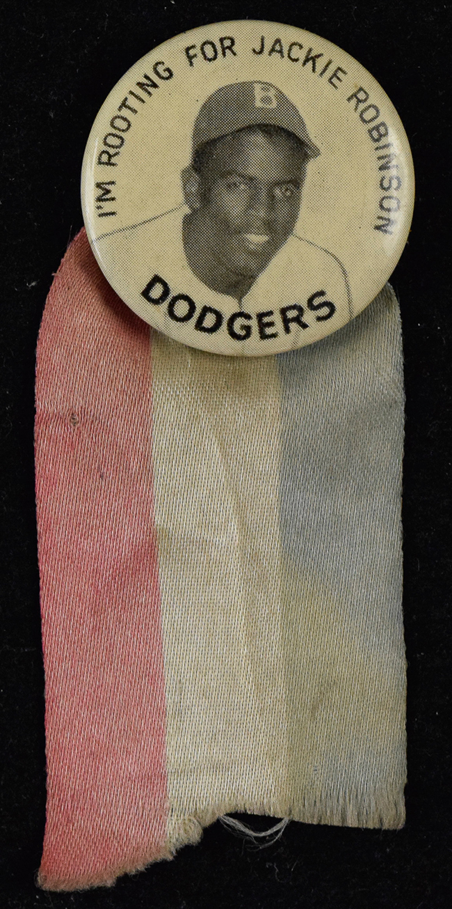 Description:"I'm Rooting For Jackie Robinson" souvenir pin c.1947 (EX-EX/MT display value, see description) Desirable pin in the smaller 1.25" size displays very nicely at the EX-EX/MT condition level with a touch of light toning. The original ribbon remains affixed. Back is missing the pin and has a circle of white paper residue inside (adhered to upper portion of ribbon): EX-EX/MT display value, see description