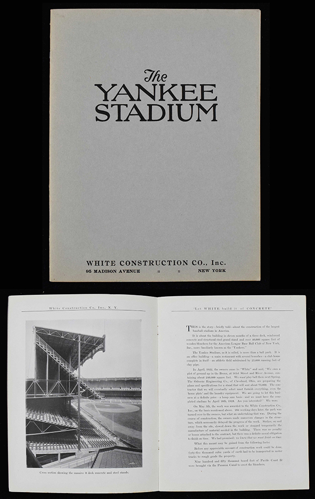 Description:"The Yankee Stadium" promotional construction book c.1923-24 (EX) Rare original softcover book as produced by White Construction Co. detailing their work in building Yankee Stadium. Filled with image and text as related to the famed venue in various stages of construction. Touch of light wear/toning and the center page is loose. Seldom offered with this recently found example one of only (3) we have offered: EX ($500-$1,000)