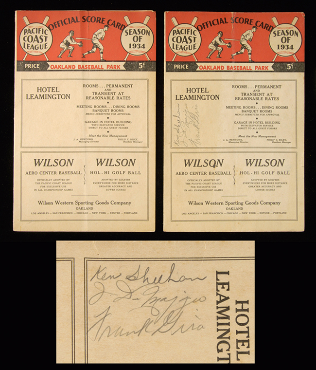 Description:Scarce 1934 San Francisco Seals scorecards with one autographed by rookie Joe DiMaggio (Scorecards VG, Sig. EX/MT-NM) Pair of original foldout scorecards as issued for game played between the San Francisco Seals and Oakland Oaks. Each scorecard features printed lineups on the interior both of which include a young Joe DiMaggio in the lineup as a rookie. One of the scorecards displays three pencil autographs on its front cover including DiMaggio rating 7/8 out of 10. The offered signature is one of the earliest we have encountered having been signed at the age of 20 while playing for the Seals. Both scorecards have typical vertical fold lines with beginning of a tear at top of the example signed by DiMaggio. Includes auction LOA from JSA: Scorecards: Range VG-EX, Signature: EX/MT-NM ($400-$600)