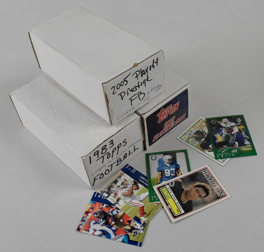 Description:1983 Topps, 2002 Topps, and 2005 Playoff Prestige (1-150) football card sets (NM overall). The 2005 Playoff Prestige set includes #s 1-150, not the high number rookie cards. Most cards appear to average NM overall