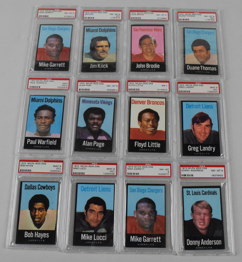 Description:Lot of (12) graded 1972 NFLPA Iron Ons including HOFers (NM-MT oc). Incl. Bob Hayes (PSA 9 MT oc), Floyd Little (PSA 7 NM), Alan Page (PSA 8 NM/MT), Paul Warfield (PSA 9 MT oc), Donny Anderson (PSA 8 NM/MT), John Brodie (PSA 8 NM/MT), (2) Mike Garrett (both PSA 8 NM/MT), Jim Kiick (PSA 8 NM/MT oc), Greg Landry (PSA 9 MT oc), Mike Lucci (PSA 9 MT oc), and Duane Thomas (PSA 8 NM/MT miscut).