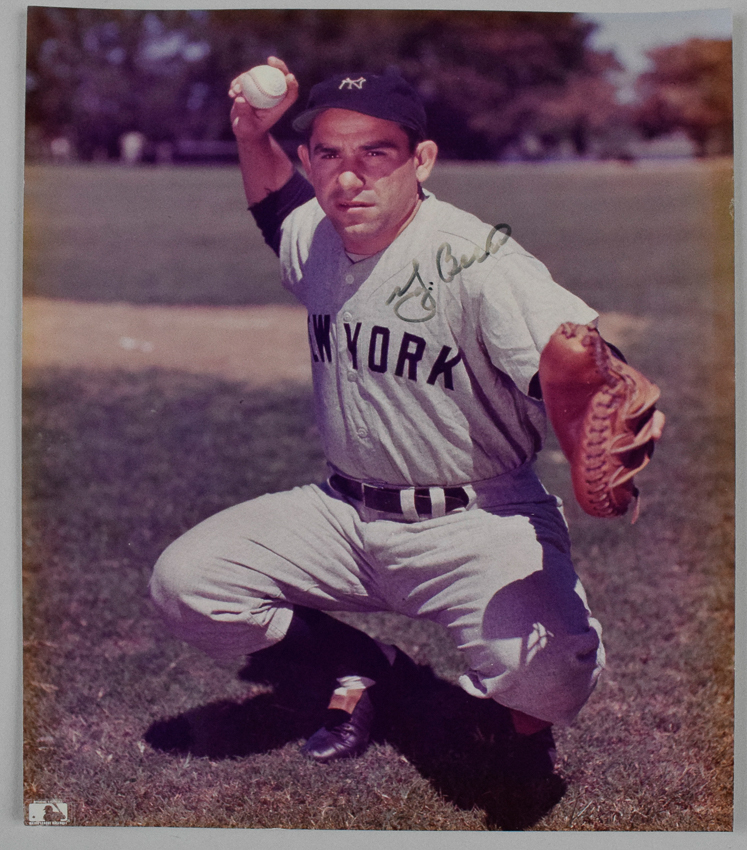 Description:Yogi Berra signed 8"x10" photograph (EX/MT). Berra signed the photo in black marker. Signature rates 7 out of 10 due to fading. Photo has some minor edge/surface wear: EX/MT