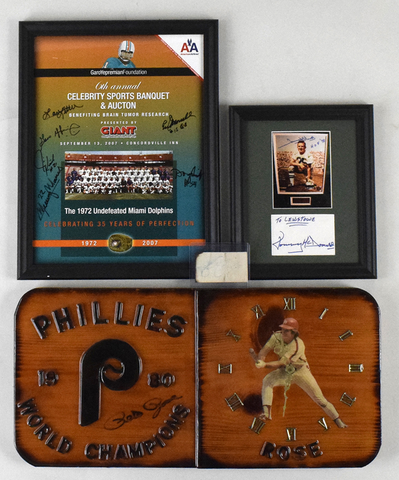 Description:Mixed sports autograph lot with some stars and HOFers (GD-NM). Includes back of a business card signed by Julius Erving (heavy wear); 12"x24" Pete Rose wooden wall clock signed by Rose (needs battery); 10"x11.5" framed Tommy McDonald display containing his autograph matted below a photo (personalized); Miami Dolphins hat signed by Don Shula; and 13.5"x17.5" framed 1972 Dolphins 35th anniversary poster signed by (6): Larry Little, Earl Morrall, Garo Yepremian, Jim Kiick, Mercury Morris, and Doug Swift. Signatures rate 5/6 (Erving) to 10 (avg 8) out of 10: GD-NM