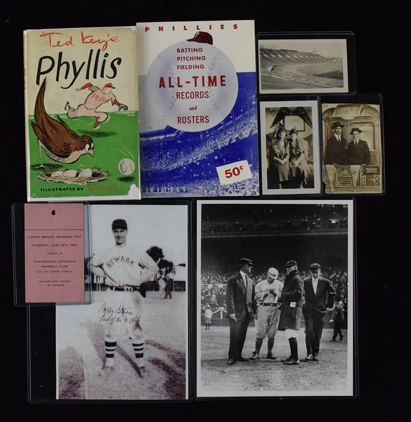 Description:Lot of assorted sports memorabilia and photos - mainly Philadelphia Phillies & Athletics related (FR/GD-NM/MT). Includes 1913 real photo postcard picturing two men with Philadelphia A's World Champions pennants (FR/GD); c.1910s-20s 3"x4.5" photo picturing two women with a Phillies pennant in the background; 2.75"x4.5" c.1926 photo picturing the newly built Municipal Stadium; 8"x11.5" 1942 press photo picturing a fight in the stands during a game at Ebbets Field; 6/29/1944 Athletics guest pass for Junior Service Wardens Day game against the Indians; 1953 "Phillies All-Time Records and Rosters" (similar to a media guide); 1957 "Phyllis" hardcover book by Ted Key; (5) Philadelphia Athletics Historical Society mugs: Connie Mack, (2) different Jimmie Foxx, Gus Zernial (signed), and Eddie Joost; 8/23/2002 Reading Phillies SGA baseball commemorating their 5000th game played; 6.5"x10" photo signed by Bobby Stevens with "Last of the '31 Phils" inscription; and (2) modern reproduction photos picturing 1914 Phillies opening day: FR/GD-NM/MT