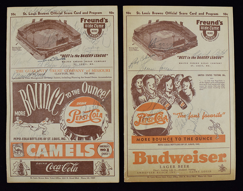 Description:Multi-signed 1950 and 1951 St. Louis Browns scorecards (EX-EX/MT). Includes 8/1/1950 Boston Red Sox at Browns scorecard signed by (7): Bob Doerr, Roy Sievers, Harry Dorish, Hank Arft, Ray Coleman, Sherm Lollar, and Jim Delsing; 8/15/1951 Cleveland Indians at Browns scorecard signed by (13): Bob Feller, Al Rosen, Dale Mitchell, Luke Easter, Ralph Winegarner, Jack Maguire, Bob Young, Fred Marsh, Ed Redys, George Zuverink (signed twice), Merrill Combs, Paul Lehner, and Ken Wood. Signatures rate 7 to 9 (avg 7/8) out of 10: EX-EX/MT