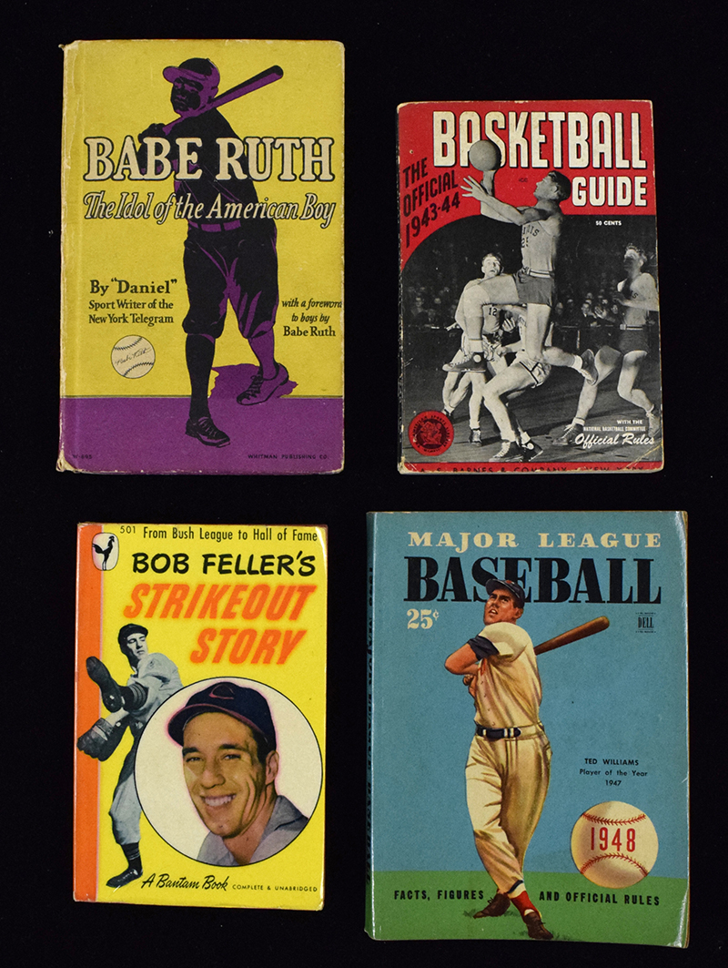 Description:Lot of vintage sports publications and photos from 1930-1953 (PR/FR-NM). Includes 1930 "Babe Ruth: The Idol of the American Boy", 1943-44 Official Basketball Guide, 1948 "Major League Baseball" with Ted Williams cover, 1948 "Bob Feller's Strikeout Story", 1948 "Babe Ruth" by Tom Meany, 1948 The Sporting News Baseball Guide, 1949 The Sporting News Dope Book with Stan Musial cover, Jan 1949 Baseball Digest (detached cover), 1950 St. Louis Browns team photo, Spring 1951 Sports Album with Musial-Kell-Lemon cover, Summer 1951 Sports Album with Feller cover, 1952 The Sporting News Dope Book with Yogi Berra cover, Feb 1952 Baseball Digest, "Baseball Stars of 1953", vintage 8"x10" photo signed by Galen Fiss (personalized), and 1948 Cleveland Indians team photo (not vintage). Most appear to average VG-VG/EX overall. Range: PR/FR-NM