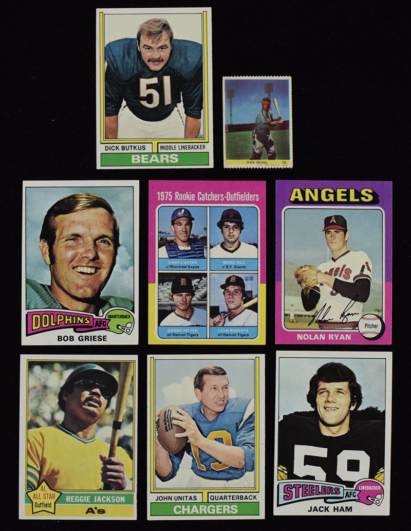 Description:Lot of (478) baseball and football cards from 1949-1976 (PR/FR-NM/MT). Includes 1949 Eureka Sportstamps #s 181, 186, 191 Stan Musial (VG/EX), and 196; 1952 Topps #142 Perkowski (PR/FR); 1953 Bowman Color #68 Reynolds (FR/GD). Remainder are mostly 1974-1976 Topps baseball and football cards including (40) HOFers. Most appear to average EX/MT-NM overall. Range: PR/FR-NM/MT