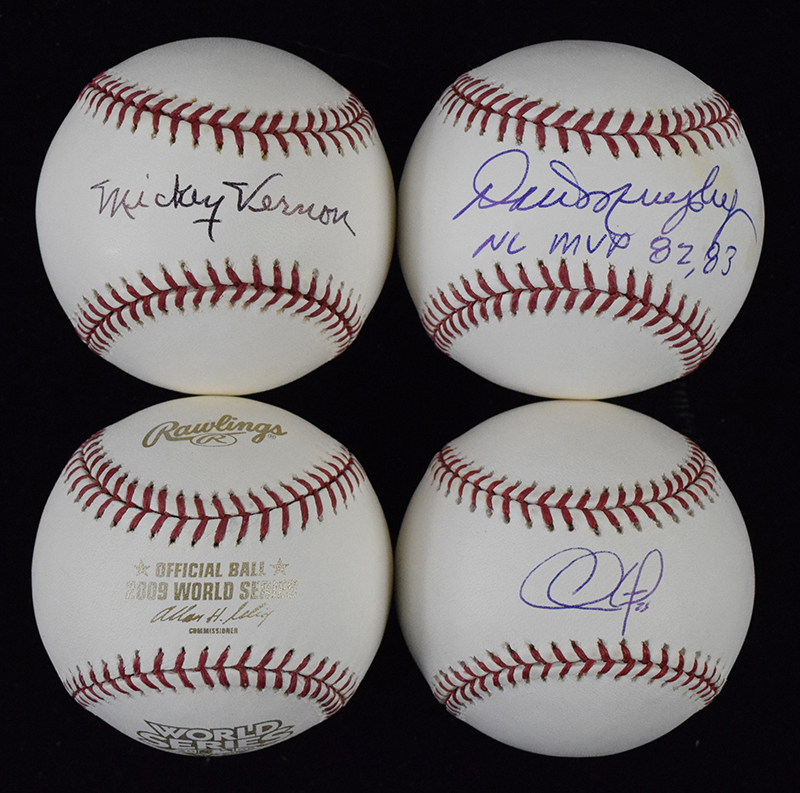 Description:Nice lot of (9) signed baseballs (EX-NM/MT). Includes B.Selig ML ball signed by Mickey Vernon, B.Selig ML ball (toning) signed by Dale Murphy with "NL MVP 82, 83" inscription, B.Selig ML ball signed by Chase Utley (MLB Authenticated), R.Manfred ML black leather baseball signed by J.P. Crawford, 2014 Wrigley Field 100th Year ball signed by Manny Trillo with "75-78" "86-88" inscription, W.White NL ball (toning) signed by Terry Mulholland, B.Selig 2009 World Series ball signed by J.A. Happ with "09 NLC" inscription, B.Selig ML ball signed by Ken Giles with "100 Mile Giles" inscription, and B.Selig 2008 World Series ball signed by Chad Durbin (MLB Authenticated). Signatures rate 8 to 9/10 out of 10: EX-NM/MT