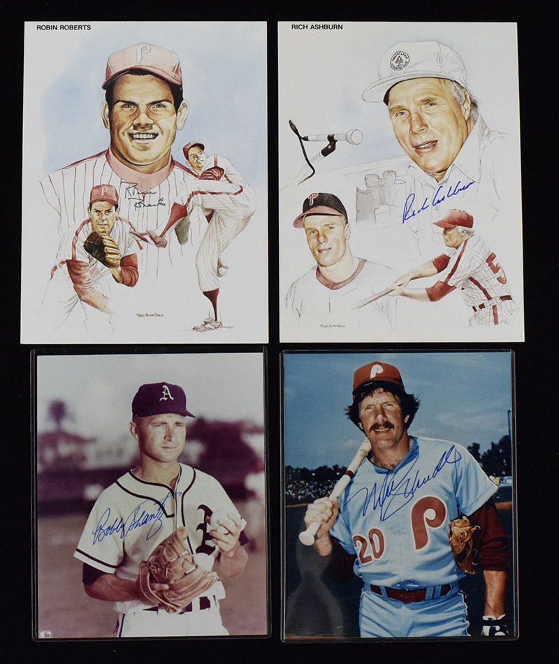 Description:Lot of (11) signed baseball photos with Ashburn, Roberts, and Schmidt (NM overall). Includes (3) signed 8.75"x11.5" prints: Richie Ashburn, Robin Roberts (corner crease), Bake McBride; and (8) signed 8"x10" photos: Mike Schmidt, Bobby Shantz, Bob Boone, Lenny Dykstra with "93 NLC" inscription, Pedro Feliz (MLB Authenticated), Willie Montanez, Ron Reed, and Warren Brusstar. Signatures rate 8/9 to 10 out of 10: NM overall other than Roberts.