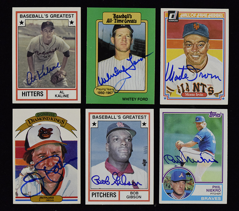 Description:Lot of (29) signed baseball cards from 1963-1995 including HOFers (VG-NM/MT). Includes Monte Irvin, Bob Lemon, Whitey Ford, Al Kaline, (2) different Jim Palmer, Bob Gibson, Phil Niekro, Ryne Sandberg, Steve Carlton, John Smoltz, Andre Dawson, Pete Rose, Johnny Callison, Gus Zernial, Clay Dalrymple, Jim Kaat, Curt Simmons, Don Money, Bob Dernier, Mark Grace, Mike Lieberthal, Tommy Greene, Kevin Stocker, Ricky Bottalico, George Vukovich, Kevin Saucier, Ivan DeJesus, and Ramon Aviles. Signatures rate 6/7 (Dalrymple) to 10 (avg 8/9) out of 10. Most cards appear to average EX/MT-NM overall. Range: VG-NM/MT