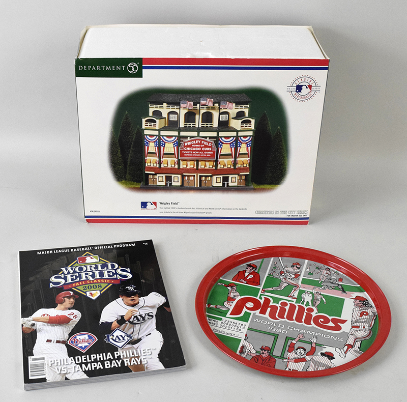 Description:Nice lot of assorted sports memorabilia and display pieces (NM-NM/MT overall). Includes 1980 Philadelphia Phillies souvenir tray; c.1981 Pete Rose keychain; 2000 "A Century of Philadelphia Phillies Baseball" souvenir book; 2001 Department 56 "Christmas in the City Series" Wrigley Field light-up faìade; 2004 Department 56 "Christmas in the City Series" Chicago White Sox refreshments stand; 2004 Department 56 Chicago Cubs light-up refreshment stand with snack dish; 2003 Phil & Phillis bobblehead from Phillies SGA; 2005 Babe Ruth bobblehead from Wilmington Blue Rocks SGA; 2008 World Series program; G.Bettman NHL Philadelphia Flyers puck; "World Champs: Philadelphia Phillies 2008" souvenir book; 2003 Phillies program; Phillies retired numbers pin set (#ed 113/2005); and other pins: NM-NM/MT overall