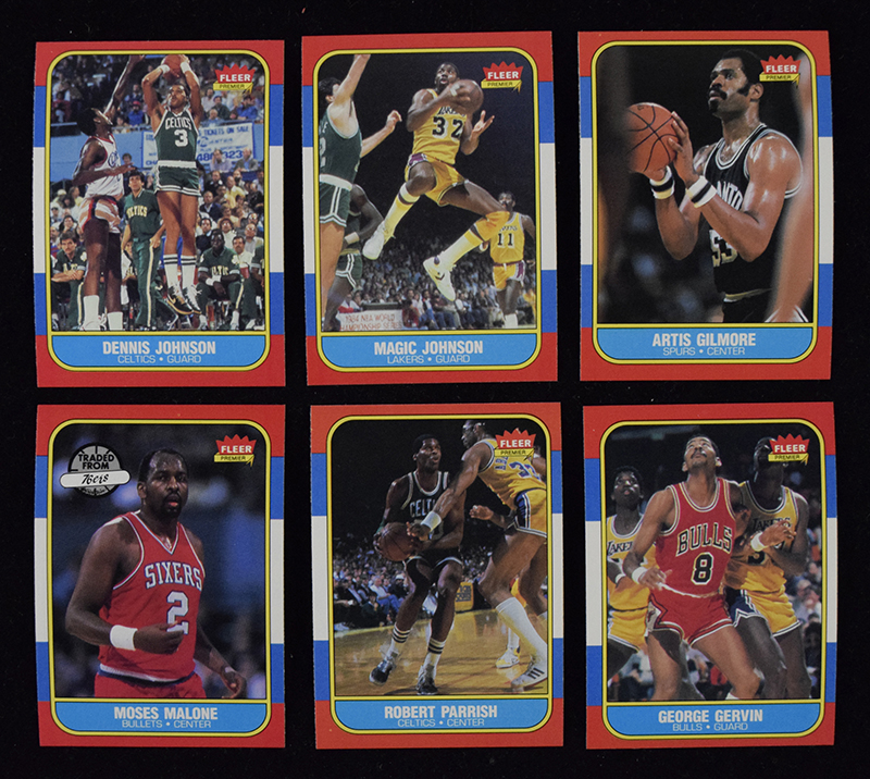 1986-87 Fleer Basketball 75-card partial set (NM-NM/MT overall). Includes #s 13, 14, 15, 16, 17, 18, 20, 23, 25, 28, 29, 34, 35, 36 George Gervin, 37 Artis Gilmore, 38, 39, 40, 41, 42, 45, 46, 47, 48, 49, 50 Dennis Johnson, 51, 52, 53 Magic Johnson, 54, 55, 58, 59, 62, 63, 69 Moses Malone, 70, 71, 72, 78, 79, 80, 81, 83, 84 Robert Parish, 85, 90, 92, 93, 94, 95, 98, 101, 102, 103, 104, 105, 106, 107, 108, 110, 112, 113, 114, 115, 116, 117, 124, 125, 126, 127, 128, 129, 130, and 132: NM-NM/MT overall