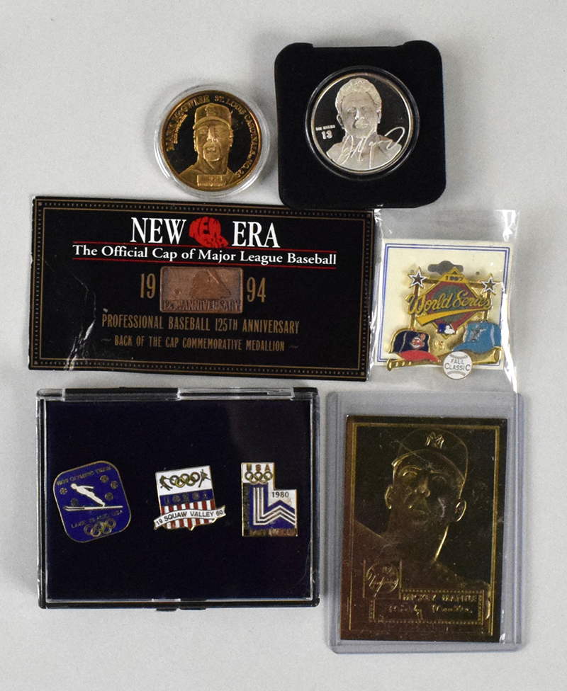 Description:Lot of assorted pins, commemorative coins, gold foil cards, etc. (NM-NM/MT overall). Gold foil cards include Mickey Mantle, Babe Ruth, Lou Gehrig, Ted Williams, (2) Ken Griffey Jr, (4) Cal Ripken Jr, (6) Nolan Ryan, (2) Mark McGwire, Roger Clemens, and Troy Aikman. Coins including 1-oz. Dan Marino and Andruw Jones, Mark McGwire and (2) Sammy Sosa bronze coins, and others. Approx. (70) souvenir pins (mainly baseball and Olympics); and other items: NM-NM/MT overall