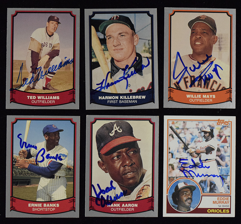 Description:Lot of (6) HOFers signed baseball cards from 1983-1988 including Ted Williams (VG/EX-NM). Includes 1983 Topps #530 signed by Eddie Murray; and (5) signed 1988 Pacific cards: Ted Williams, Harmon Killebrew, Ernie Banks, Hank Aaron, and Willie Mays. Signatures rate 8/9 to 10 out of 10. Most cards appear to average EX/MT overall. Range: VG/EX-NM