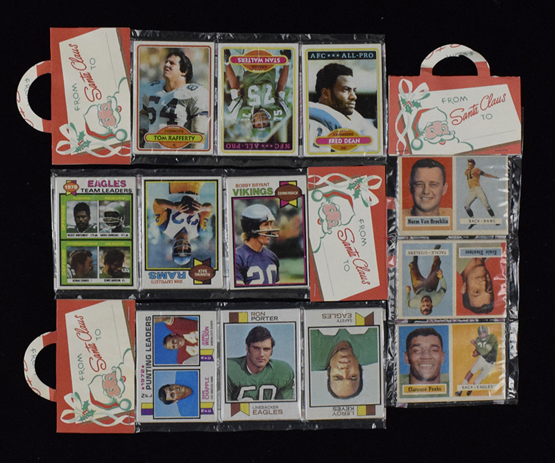 Description:1957, 1973, 1979, and 1980 Topps Football Christmas rack packs (EX/MT). All contain 12-cards per pack. Norm Van Brocklin and Ernie Stautner are visible in the 1957 pack. Packs were issued by an independent entity (not Topps). All remain sealed and show minimal wear: EX/MT appearance