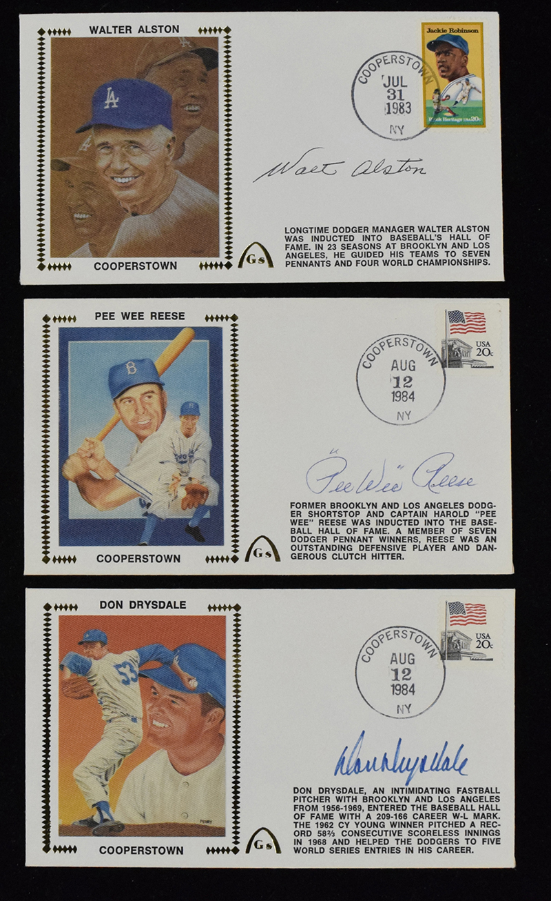 Description:Don Drysdale, Pee Wee Reese, and Walter Alston signed commemorative postal covers (NM-NM/MT). Includes 1983 envelope signed by Walt Alston, 1984 envelope signed by Pee Wee Reese, and 1984 envelope signed by Don Drysdale. Signatures rate 8/9 to 9/10 out of 10: NM-NM/MT