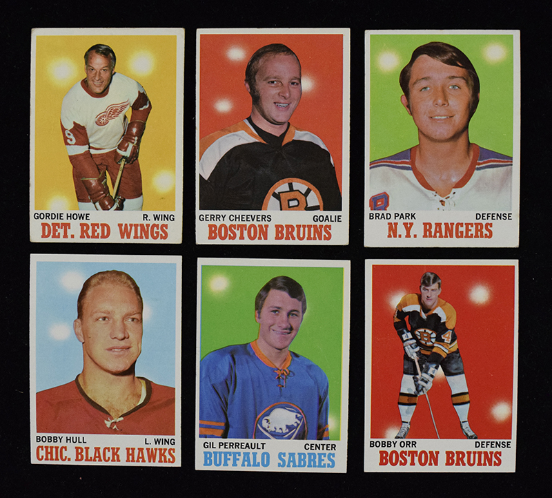 1970-71 Topps Hockey card set (GD-NM). Key cards grade: #s 3 Bobby Orr (VG/EX), 15 Bobby Hull (EX-EX/MT), 29 Gordie Howe (VG), 67 Brad Park rookie (VG), 131 Gilbert Perreault rookie (EX/MT-NM). Remainder appear to average VG/EX overall. Range: GD-NM