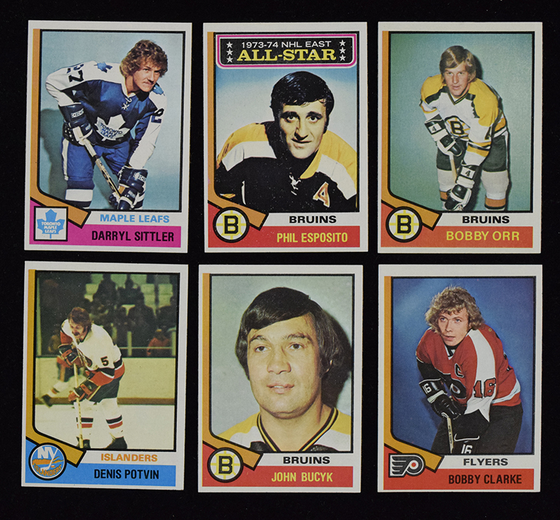 Description:1974-75 Topps Hockey card set (VG-NM/MT). Key cards grade: #s 100 Bobby Orr (NM oc), 195 Denis Potvin rookie (NM oc). Remainder appear to average EX/MT-NM overall, with any issues mainly due to centering rather than structural wear. Range: VG-NM/MT