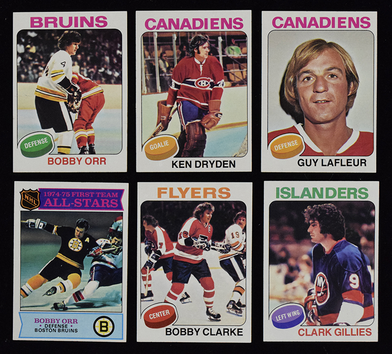 Description:1975-76 Topps Hockey card set (VG-NM/MT). Key cards grade: #s 35 Ken Dryden (NM), 100 Bobby Orr (EX), 126 Guy Lafleur (EX/MT oc), 199 Clark Gillies rookie (EX/MT-NM), 241 Larry Robinson (NM), 250 Bobby Clarke (NM), 275 Denis Potvin (NM), 288 Orr (NM). Remainder appear to average EX/MT-NM. Range: VG-NM/MT