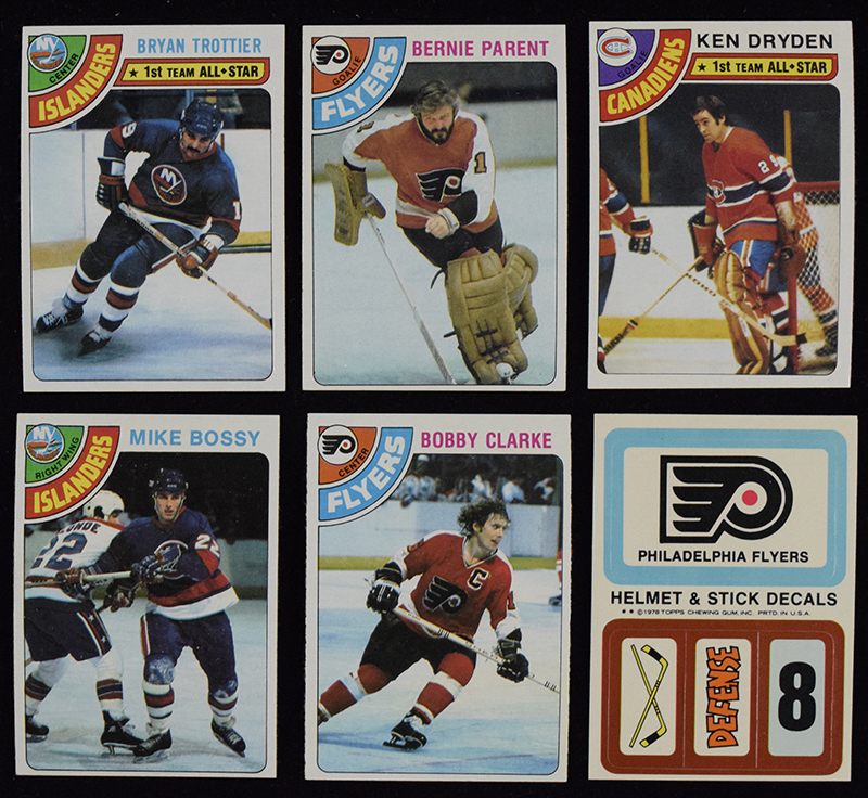 Description:1978-79 Topps Hockey card set with Team Inserts set (VG-NM/MT). #115 Mike Bossy rookie card grades EX/MT-NM, and the rest of the set appears to average NM overall. Team Inserts set averages EX/MT-NM overall. Range: VG-NM/MT