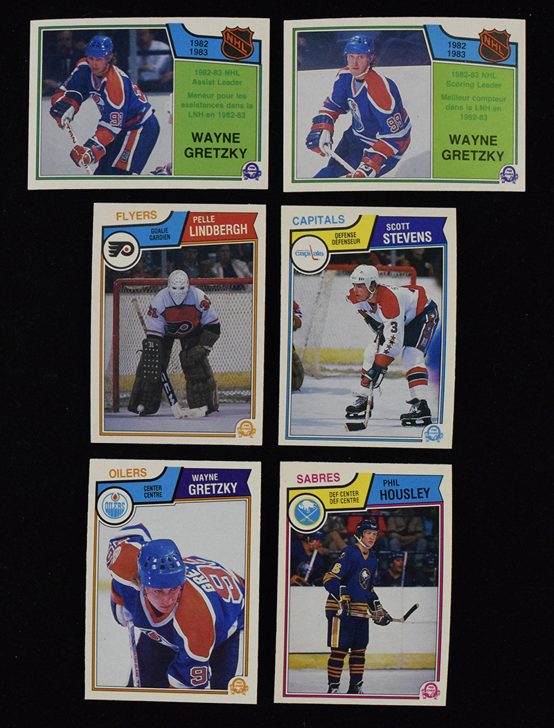 Description:High grade 1983-84 O-Pee-Chee hockey card set (NM-NM/MT overall). Key cards grade: #s 29 Wayne Gretzky (NM), 268 Pelle Lindbergh rookie (NM-NM/MT), 376 Scott Stevens rookie (NM/MT). Remainder appear to average NM-NM/MT overall.