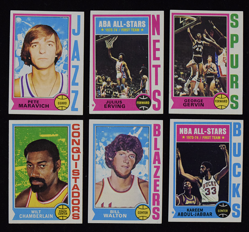 1974-75 Topps Basketball card set (VG/EX-NM). Key cards grade: #s 1 Kareem Abdul-Jabbar (EX), 39 Bill Walton rookie (EX/MT-NM), 196 George Gervin rookie (EX/MT-NM), 200 Julius Erving (EX), 250 Wilt Chamberlain (NM). Remainder appear to average EX/MT overall. Range: VG/EX-NM