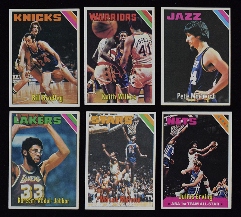 1975-76 Topps Basketball card set (VG-NM). Key cards grade: #s 50 Wilkes rookie (NM), 75 Pete Maravich (EX/MT wax stain on back), 90 Kareem Abdul-Jabbar (VG), 254 Moses Malone rookie (NM print defect), 300 Julius Erving (EX oc). Remainder appear to average EX/MT overall. Range: VG-NM