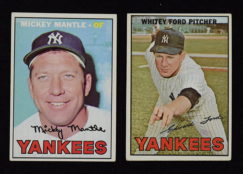 Mickey Mantle and Whitey Ford 1967 Topps Baseball cards (VG-VG/EX). Includes #s 5 Whitey Ford (VG), and 150 Mickey Mantle (VG/EX).
