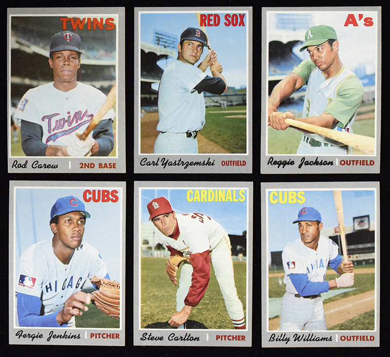 Lot of (25) stars and HOFers 1970 Topps Baseball cards (VG-NM). Includes #s 10 Carl Yastrzemski (VG-VG/EX), 17 Hoyt Wilhelm (EX oc), 61 NL Batting Leaders (VG/EX), 62 AL Batting Leaders (VG/EX-EX), 63 NL RBI Leaders (EX), 64 AL RBI Leaders (EX), 65 NL HR Leaders (EX-EX/MT), 67 NL ERA Leaders (EX/MT-NM), 68 AL ERA Leaders (EX/MT oc), 69 NL Pitching Leaders (EX), 70 AL Pitching Leaders (VG/EX oc), 71 NL Strikeout Leaders (EX oc), 140 Reggie Jackson (EX), 150 Harmon Killebrew (VG/EX oc), 170 Billy Williams (VG/EX), 211 Ted Williams (VG oc), 220 Steve Carlton (EX-EX/MT), 230 Brooks Robinson (VG), 240 Fergie Jenkins (EX-EX/MT), 250 Willie McCovey (VG-VG/EX), 290 Rod Carew (VG/EX oc), 291 Leo Durocher (VG), 315 Luis Aparicio (VG/EX oc), 330 Lou Brock (EX/MT-NM), and 346 Red Schoendienst (VG-VG/EX).