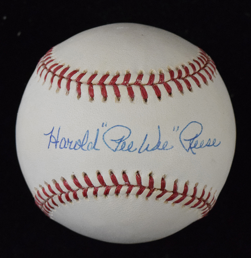 Harold "Pee Wee" Reese signed L.Coleman NL baseball (NM). Reese signed the sweet spot in blue ink. Signature rates 8/9 out of 10: NM