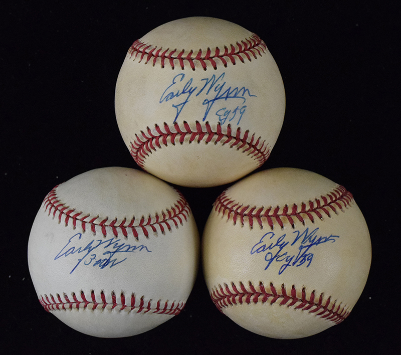 Description:Lot of (3) Early Wynn signed and inscribed G.Budig AL baseballs (VG/EX-EX). Wynn signed the sweet spot of each ball in blue ink and added "Cy 59" to two and "300 W" to the other. Signatures rate 8 to 9/10 out of 10. Each has toning on all panels, with one slightly less than the other two: VG/EX-EX