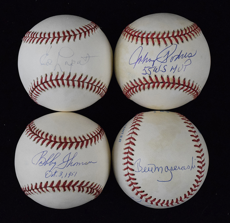 Description:Lot of (5) signed baseballs - most relating to historic events (VG-NM). Includes B.Brown AL ball (toning) signed by both Bill Mazeroski and Ralph Terry with "10-13-60" inscription, B.Brown AL ball signed by Ed Lopat, W.White NL ball signed by Bobby Thomson with "Oct. 3, 1951" inscription, L.Coleman NL ball (toning) signed by Johnny Podres with "55 WS MVP" inscription, and B.Brown AL ball (stained) signed by Don Larsen with "10-8-56" inscription. Signatures rate 7 (Lopat) to 9/10 (avg 8) out of 10: VG-NM