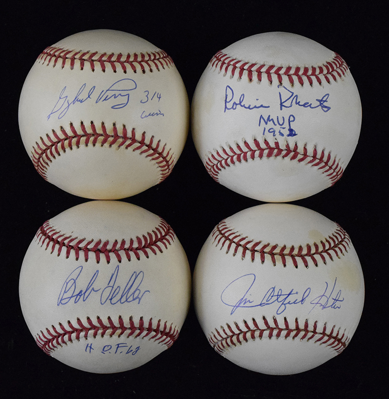 Description:Lot of (7) HOF Pitchers signed baseballs (EX-EX/MT). Includes W.White NL ball signed by Robin Roberts with "MVP 1952" inscription, B.Brown AL ball signed by Bob Feller with "HOF 62" inscription, G.Budig AL ball signed by Jim "Catfish" Hunter, L.Coleman NL ball signed by Gaylord Perry with "314 Wins" inscription, W.White NL ball signed by Bob Gibson, L.Coleman NL ball signed by Juan Marichal with "HOF 1983" inscription, and W.White NL ball signed by Rollie Fingers with "1981 Cy Young MVP" inscription. Signatures rate 8 to 9/10 out of 10. All have areas of light to moderate toning: EX-EX/MT