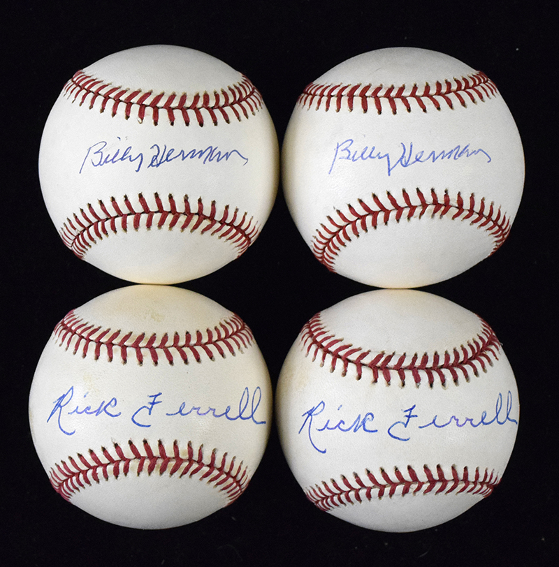 Description:Lot of (4) Billy Herman and (3) Rick Ferrell signed baseballs (EX-NM). Includes (4) W.White NL balls signed by Billy Herman, and (3) B.Brown AL balls signed by Rick Ferrell. Signatures rate 6/7 (one Herman) to 9/10 (avg 8) out of 10. Most balls appear to average EX/MT overall due to minor toning. Range: EX-NM
