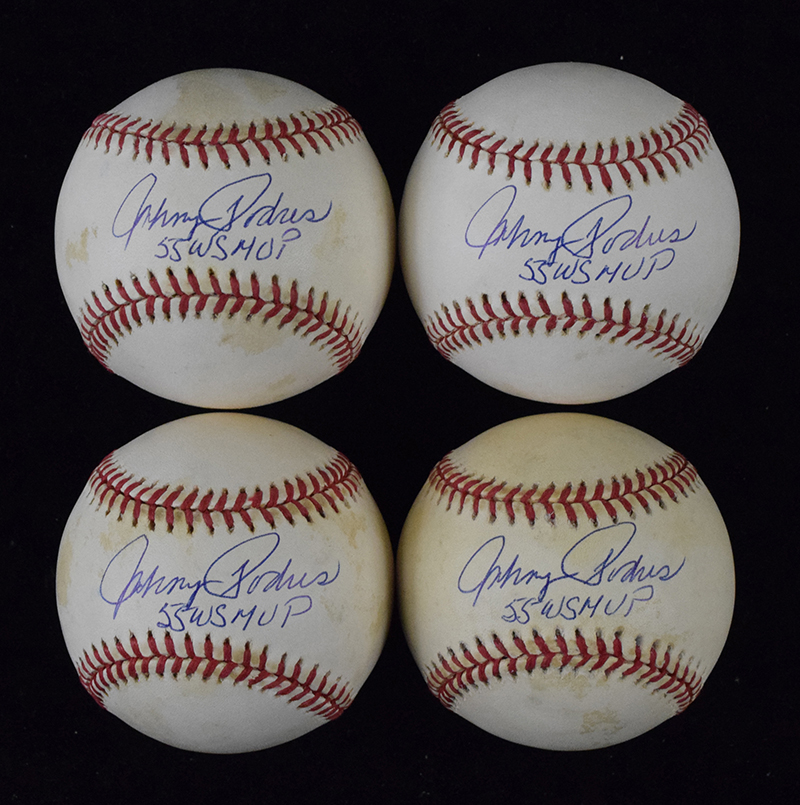 Description:Lot of (6) Johnny Podres signed & inscribed L.Coleman NL baseballs (VG/EX-EX/MT). Podres signed the sweet spot of each ball in blue ink and added "55 WS MVP" inscription to each. Signatures rate 8 to 9/10 out of 10. Most balls appear to average EX overall due to toning. Range: VG/EX-EX/MT