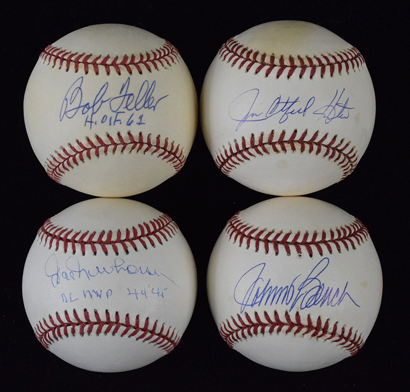 Description:Lot of (8) HOFers signed baseballs (EX-NM). Includes B.Brown AL ball (toning) signed by Bob Feller with "HOF 62" inscription, B.Brown AL ball signed by Hal Newhouser with "AL MVP 44-45" inscription, B.Brown AL ball (light toning) signed by Harmon Killebrew with "573 HR's" inscription, G.Budig AL ball (toning) signed by Jim "Catfish" Hunter, L.Coleman NL ball (light toning) signed by Johnny Bench, G.Budig AL ball (light toning) signed by Frank Robinson, G.Budig AL ball (toning) signed by Carlton Fisk, and B.Brown AL ball (light toning) signed by Luis Aparicio. Signatures rate 7 to 9/10 (avg 8) out of 10: EX-NM