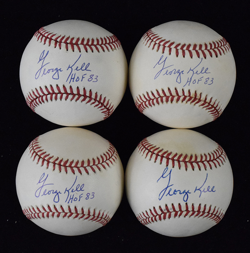 Description:Lot of (9) George Kell signed B.Brown AL baseballs (EX-NM). Kell signed the sweet spot of each ball in blue ink and added "HOF 83" inscription to all but two. Signatures rate 7/8 to 9/10 out of 10. Most balls appear to average EX/MT overall due to minor toning. Range: EX-NM