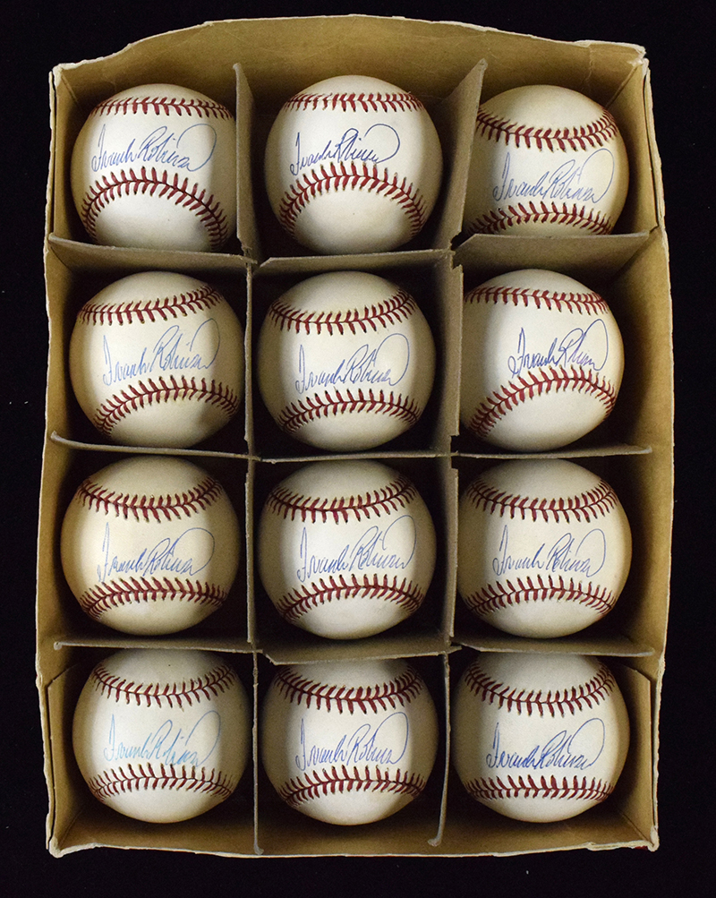 Description:Lot of (12) Frank Robinson signed baseballs (EX-EX/MT). All are signed on official NL or AL balls. Robinson signed the sweet spot of each ball in blue ink. Signatures rate 7 to 9/10 (avg 8) out of 10. All have areas of light to moderate toning: EX-EX/MT