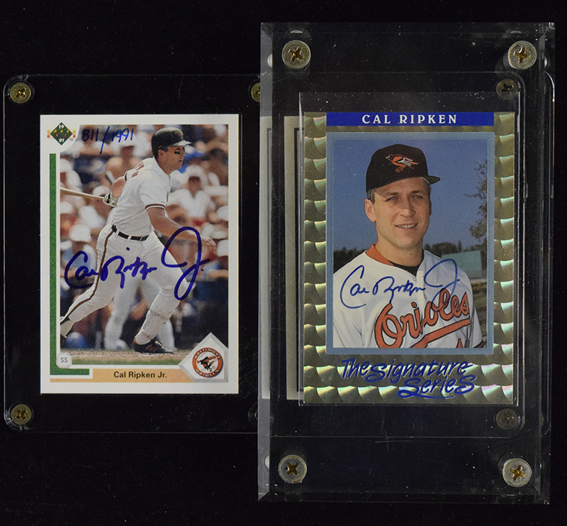 Description:Cal Ripken Jr. signed limited edition 1991 Upper Deck card & signed 1992 Donruss "Elite" insert card (NM-NM/MT). Includes 1991 Upper Deck #347 signed by Ripken in blue marker rating 9/10 out of 10 (#ed 811/1991); and 1992 Donruss "Elite Signature Series" insert card signed by Ripken in blue marker rating 8/9 out of 10: NM-NM/MT