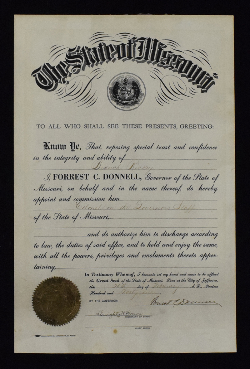 Description:1941 Branch Rickey certificate from The State of Missouri appointing him to the governor's staff (EX). 11"x17" certificate appointing Rickey as "Colonel on the Governor's Staff", and signed by Governor Forrest Donnell at the bottom. Minor handling wear, with light age toning, and tape residue along the back top edge: EX