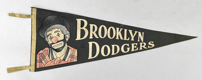 Description:Brooklyn Dodgers vintage pennant, c.1950s (VG/EX). 29.5" dark green Dodgers pennant with white lettering and Bum graphic at the left. Discoloration along the white edge and tassels, along with small tack holes, and some cracking to the graphics: VG/EX