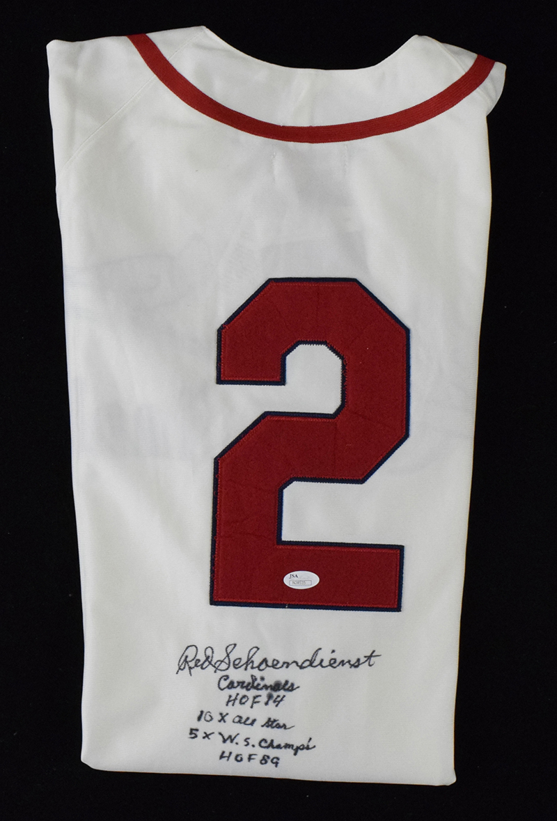 Description:Red Schoendienst signed & multi-inscribed St. Louis Cardinals jersey - JSA (NM). Cooperstown Collection size 50 Cardinals #2 Red Schoendienst 1946 style jersey signed by Schoendienst in black marker with "Cardinals HOF 14" "10X All Star" "5X WS Champs" "HOF 89" inscriptions. Signature rates 8/9 out of 10. JSA serial #ed sticker is affixed. Tagging is faux Mitchell & Ness, with Schoendienst's name spelled incorrectly on the front tail: NM