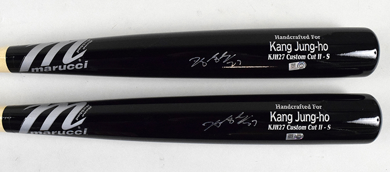 Description:Lot of (9) Jung Ho Kang signed professional model baseball bats - MLB Authenticated (NM-NM/MT, unused). Includes (9) 34" Marucci "KJH27 Custom Cut II - S" Jung Ho Kang model bats all signed by Kang in silver marker. Signatures rate 7/8 to 9/10 out of 10. MLB Authenticated serial #ed hologram sticker is affixed to each. Bats remain unused: NM-NM/MT