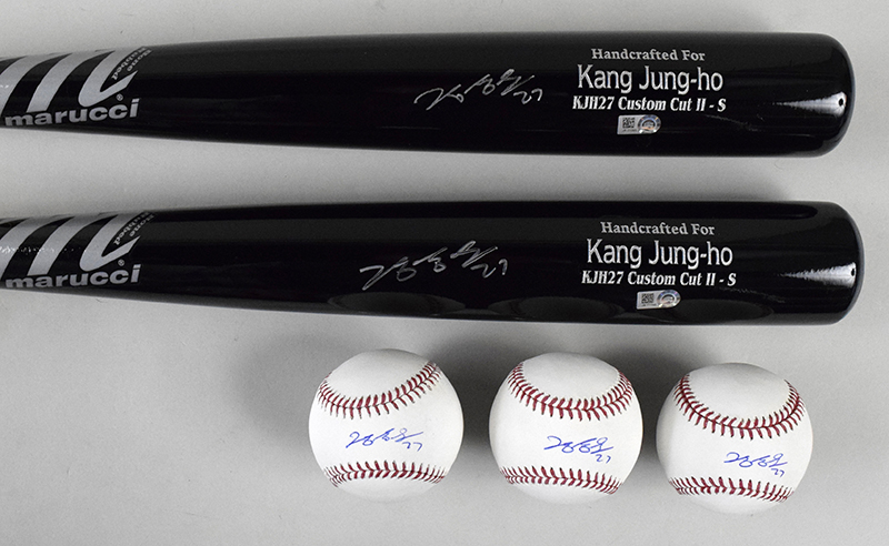 Description:Lot of (5) Jung Ho Kang signed professional model baseball bats & (10) signed baseballs - MLB Authenticated (NM-NM/MT). Includes (5) 34" Marucci "KJH27 Custom Cut II - S" Jung Ho Kang model bats all signed by Kang in silver marker (unused), and (10) R.Manfred ML balls all signed by Kang in blue ink. Signatures rate 7 to 9/10 (avg 8) out of 10. MLB Authenticated serial #ed hologram sticker is affixed to each: NM-NM/MT