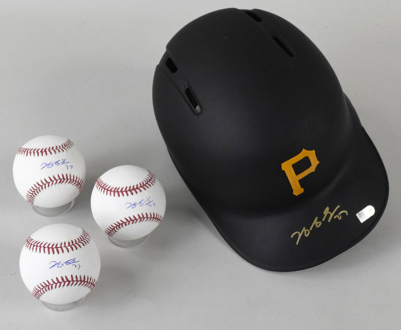 Description:Jung Ho Kang signed Pittsburgh Pirates professional quality batting helmet and (12) signed baseballs (NM-NM/MT). Includes a Rawlings MLB Authentic Collection On-Field size 7-1/8 Pirates batting helmet signed by Kang in gold marker, and (12) R.Manfred ML balls all signed by Kang in blue ink. Signatures rate 7/8 to 9/10 out of 10. MLB Authenticated serial #ed hologram sticker is affixed to each: NM-NM/MT