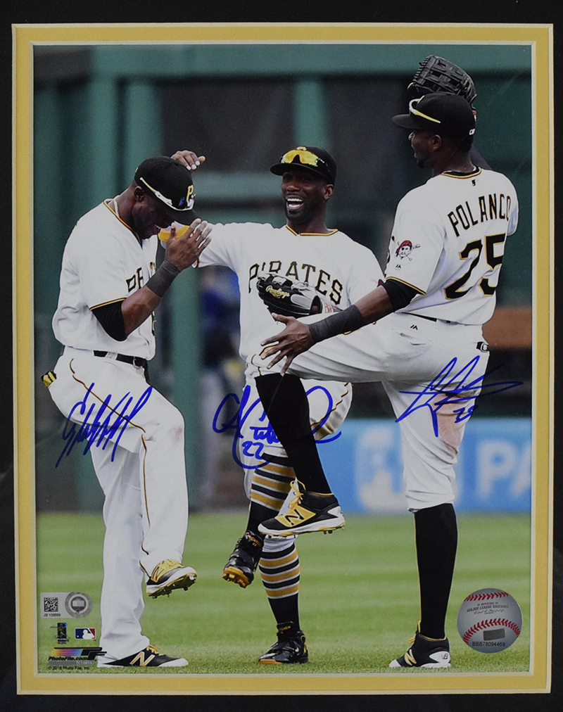 Description:Andrew McCutchen, Gregory Polanco, and Starling Marte multi-signed framed photo - MLB Authenticated (NM). Frame measures approx. 13.5"x16.5". All three signed the photo in blue marker. Signatures rate 9 to 10 out of 10. MLB Authenticated serial #ed hologram sticker is affixed. Due to framing, complete condition is unknown: NM appearance