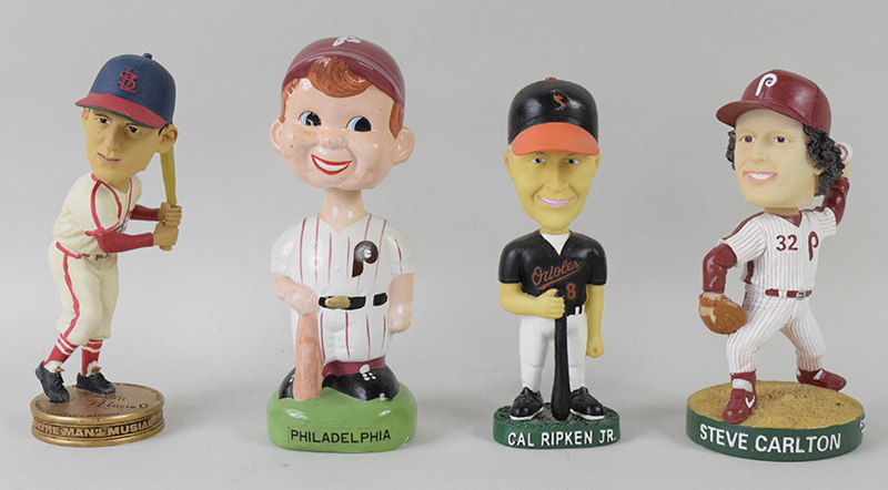 Description:Large lot of assorted baseball bobbleheads - mostly stadium giveaways (NM overall). Includes 1995 SAM Cal Ripken Jr, 1990s Philadelphia Phillies, Pittsburgh Pirates, Baltimore Orioles, and umpire. Remainder are SGAs: Lou Gehrig, Stan Musial, Steve Carlton, Cal Ripken Jr, Harry & Whitey (Harry Kalas / Richie Ashburn), Roy Halladay, Vida Blue, Cole Hamels, (3) different Chase Utley, Jamie Moyer, Placido Polanco, Charlie Manuel, Phil & Phillis. All are without their boxes, but most appear to average NM overall. Range: EX-NM/MT