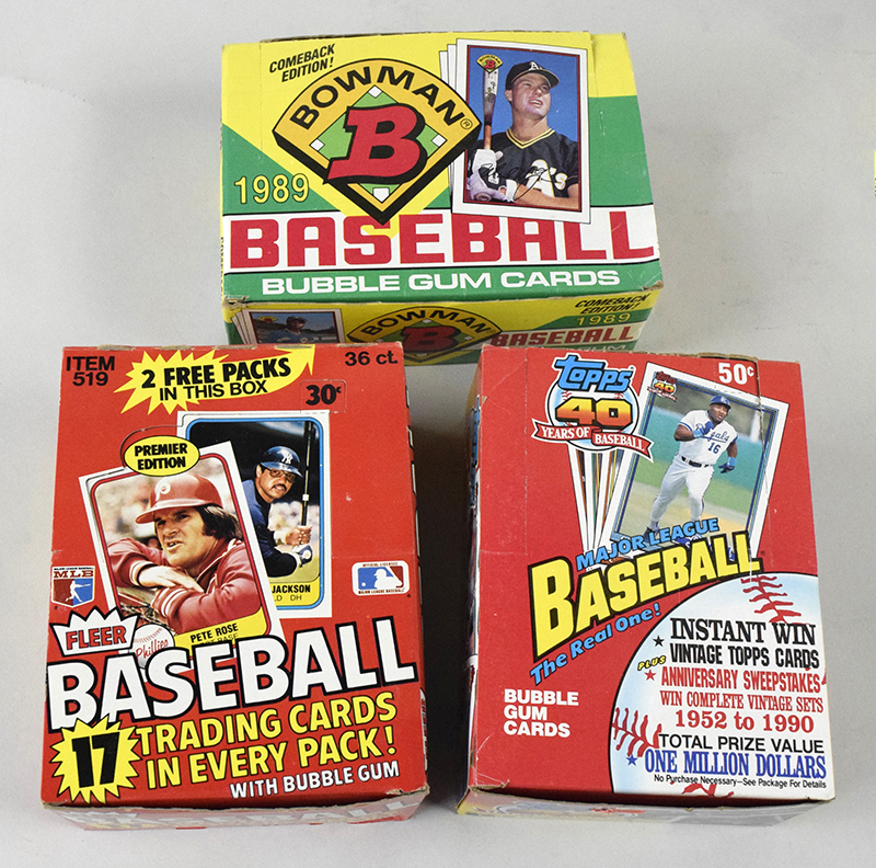 Description:Lot of (7) baseball card wax boxes from 1981-1991 (NM overall). Includes (3) 1981 Fleer, 1989 Bowman, 1990 Score, and (2) 1991 Topps. A few of the boxes have some handling/storage wear, but packs appear unharmed/untouched, and it is presumed that the cards inside remain in high grade condition: NM overall
