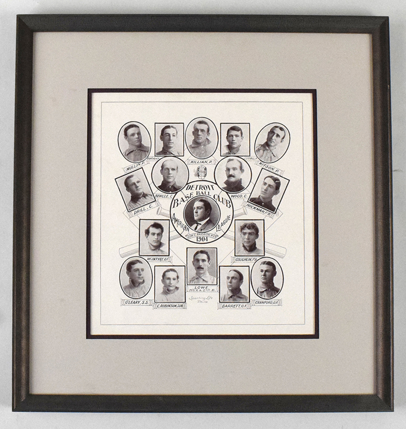Description:1904 Sporting Life W601 Detroit Tigers team composite (framed). Frame measures 18.5"x19.5". Portraits include HOFers Sam Crawford and Ed Barrow. Due to framing, complete condition is unknown. Displays as NM at first glance and from a distance, but a light horizontal crease can be seen when viewed closely.